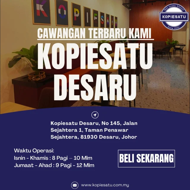 LOKASI KOPIESATU USAHAWAN Betul ke macam ni? #kopiesatu #citarasalokalkual Wajah baharu outlet Kopiesatu Kementerian Pembangu Outlet Licensing Kopiesatu yang terbaru kini dibuk Jom rasai kelainan kopi di Kopiesatu 😎 #kopies ✨ Wajah baharu, semangat yang sama. Kopiesatu Ke Biji kopi Kopiesatu dari mana? @fama.malaysia #k Kopiesatu @NS Fest Nilai masih berlangsung sampai Dah rasa Kopiesatu ke belum? @fama.malaysia #ko Jemput singgah kepada warga Nilai dan kawasan seki Apa pilihan anda? @fama.malaysia #kopiesatu #ci Fakta ringkas yang buat anda pandang kopi dengan c PEMBUKAAN CAWANGAN BAHARU! Kopiesatu kini rasmi POV: Orang tanya kenapa aku senyap… Padahal otak Creamy pistachio with a perfect nutty note. Your n “Kopiesatu Dot 3, Bandar Baru Selayang kini berw CAWANGAN TERBARU KOPIESATU DESARU! Yes, Kopiesatu ☕✨ LATTE ART THROWDOWN @ KL Park Festival 2025 PROMOSI MERDEKA KOPIESATU! Sempena sambutan Hari Kopi dulu baru kamu #kopiesatu #kopi #fama #coffee Art of Speed 2025, kami datang! Kopiesatu akan ad